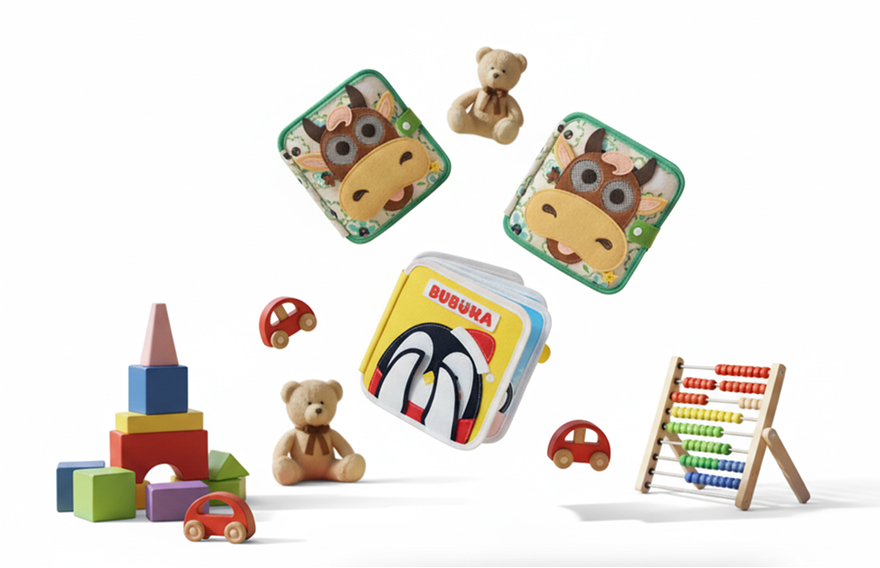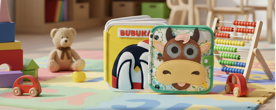 Libro de fieltro con elementos interactivos, embalado en caja de cartón y bolsa de plástico para higiene.